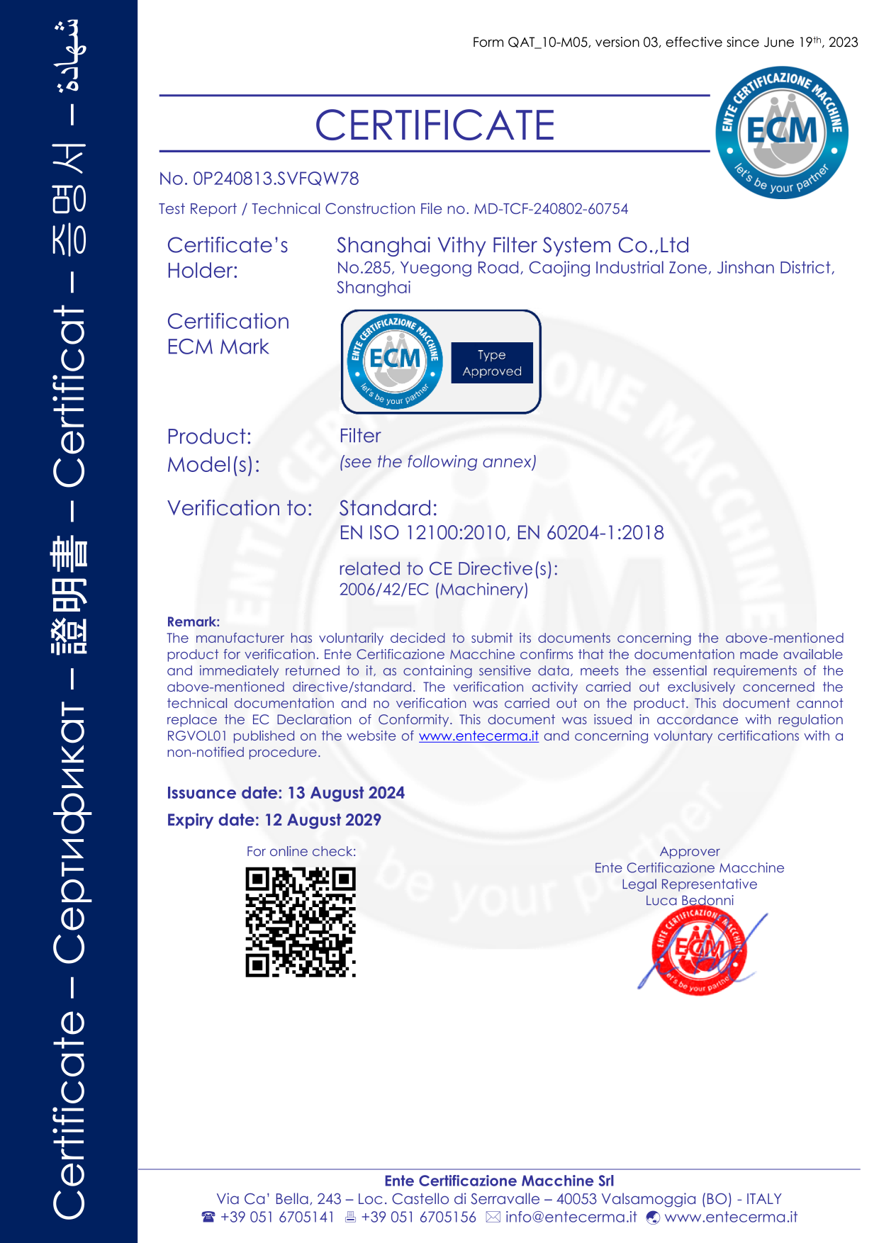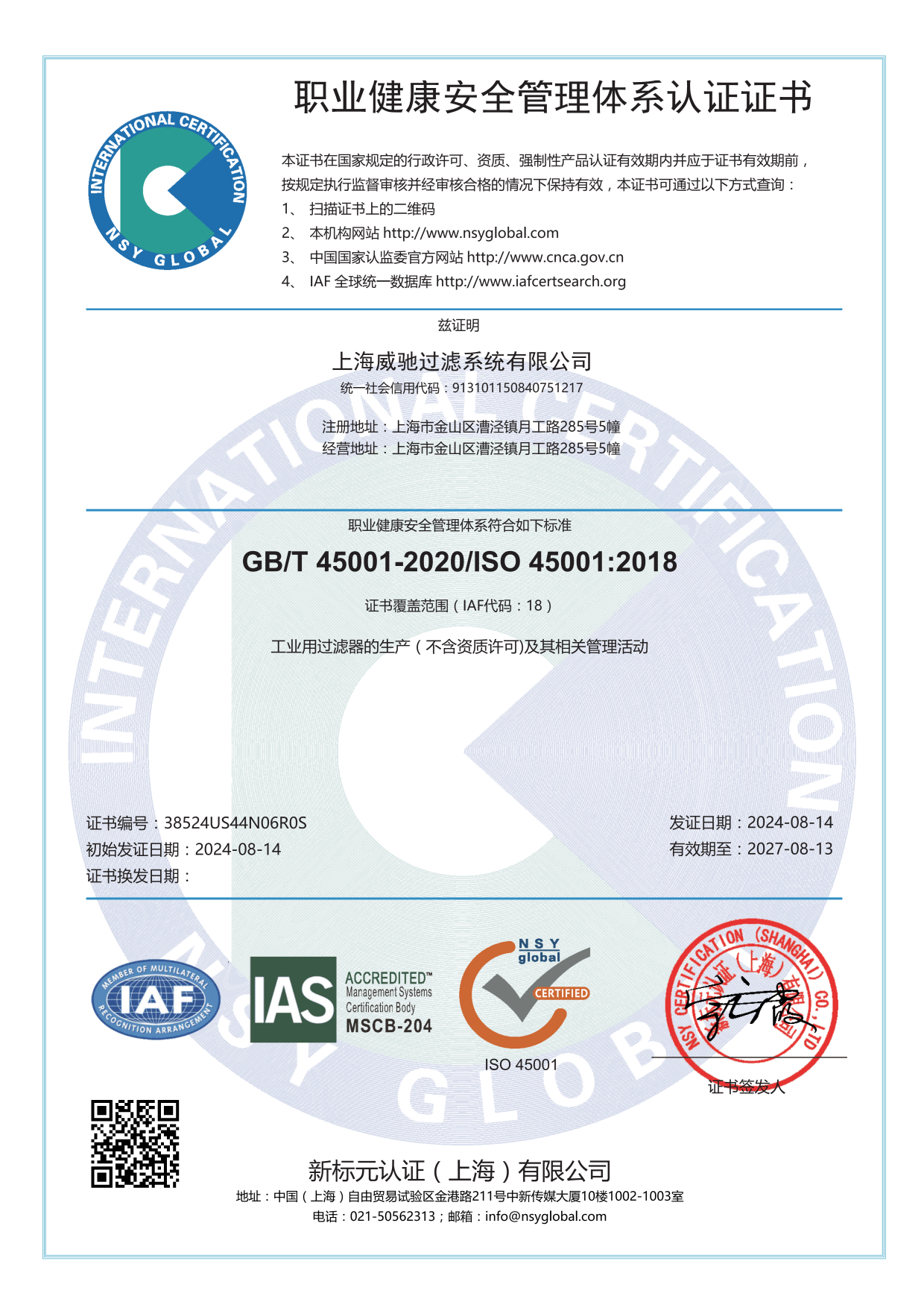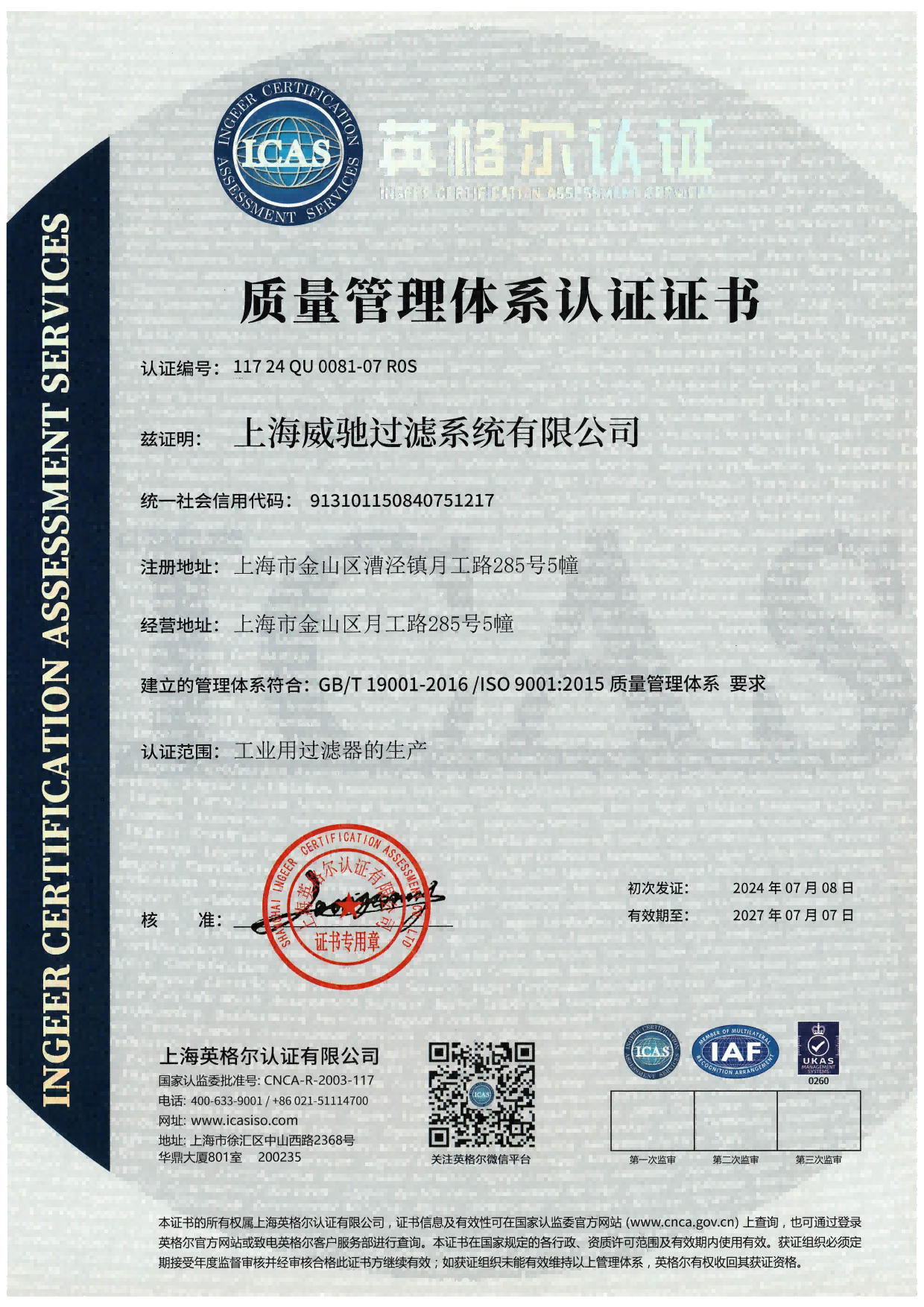 VITHY威驰过滤制造基地与研发中心位于上海,核心团队拥有十年以上丰富的研发及制造经验,通过及受理的发明专利和实用新型专利数项。威驰公司已全面通过ISO9001-2015质量管理体系认证,CE认证,严格遵循GB150制造和检验标准,严格按照规范工艺生产制造过滤设备与精密过滤元件。威驰公司拥有自主进出口权。威驰公司为中国过滤与分离产业技术创新战略联盟理事单位,中国化工企业管理协会会员单位,中国淀粉工业协会会员单位,中国生物发酵产业协会会员单位,中国生物发酵产业协会环保分会理事单位。